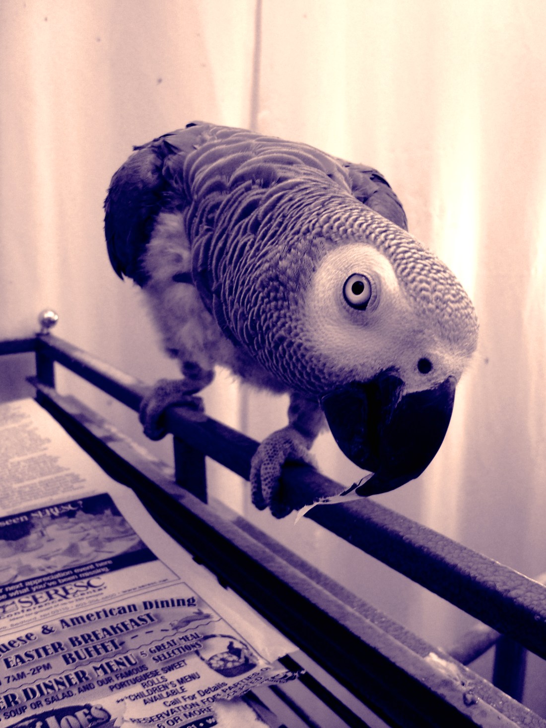 On Tuesday afternoons, I sit in the lab and procrastinate. It is a ritual. In the windowless room, time is still. I am alone between the hours of three and five, one wide expanse, during which the refrigerator softly hums, and the parrots, G and W, rifle carefully through their grey feathers with their beaks, or huddle on their perches, one foot raised, dozing. Or they squeal and whistle along with the music I play for us, watching me wide-eyed as I dance, solo, about the tiny room, singing for the three of us. We enjoy our time together.