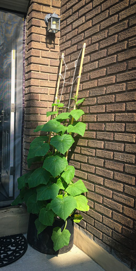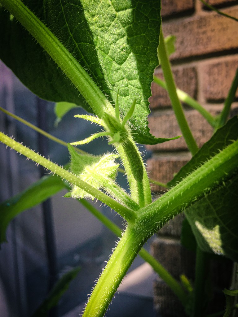 On the growing front, I stuck two Beit Alpha cucumber seeds in some soil about four weeks ago. I bought the seed packet because the photo on the front looked like the little Persian cukes we buy in the supermarket in plastic packages and I suspected I could probably grow them in a pot on my stoop. Within a week sprouts unfolded themselves from the soil, and soon the plants were spilling out vines and foot-wide leaves all over the ground. So I built them a trellis out of a couple of bamboo poles and cotton macrame cord, and the vines sent little tendrils like hands to wind around the string. At the point of this writing the vines are five feet long and considering engulfing our porch lamp. They are covered in bristles that stick in my fingertips like needles. The grabbing coils wind around the trellis, around other vines, around leaves, whatever they connect with. If I stood still long enough they would probably wrap me up in a cucumber hug.