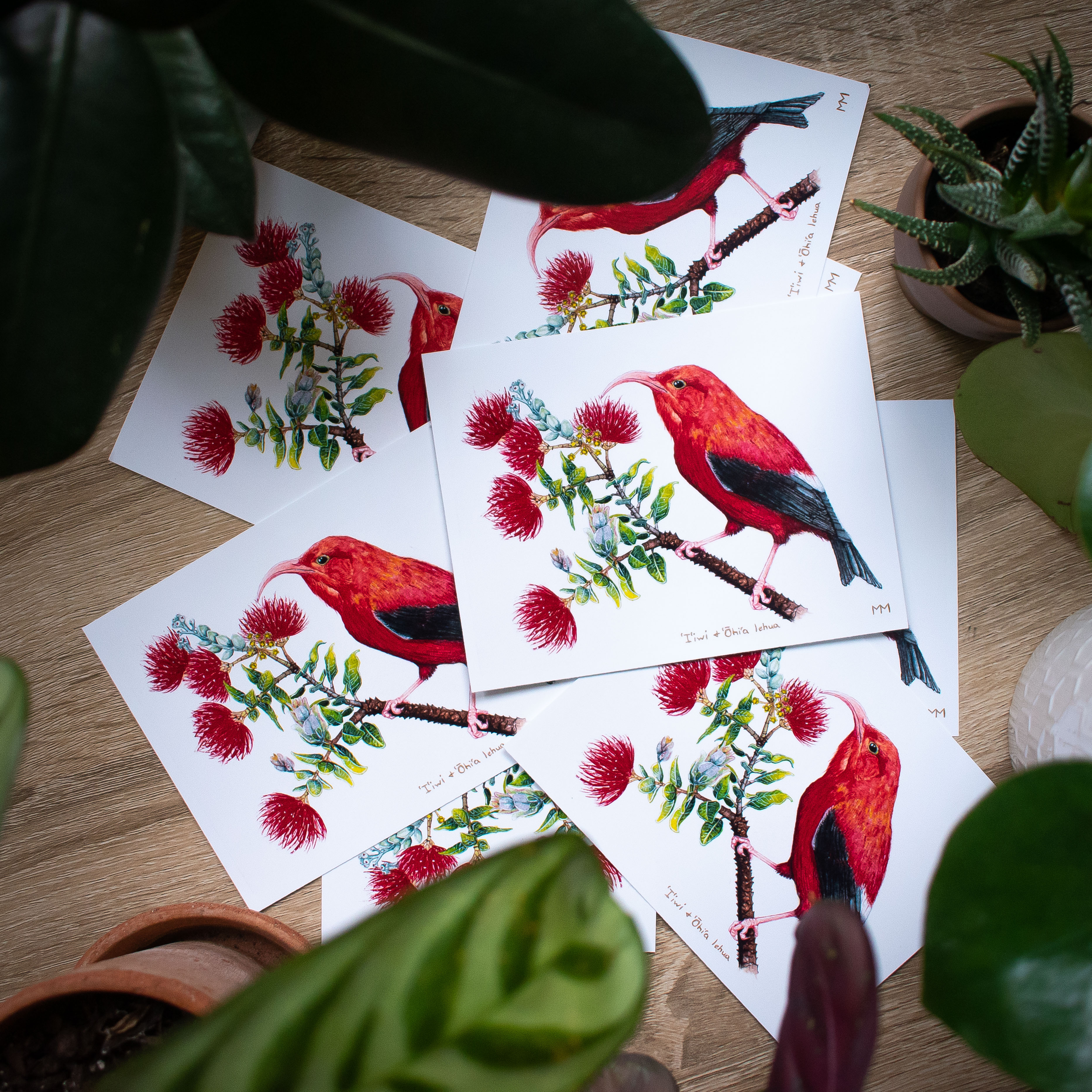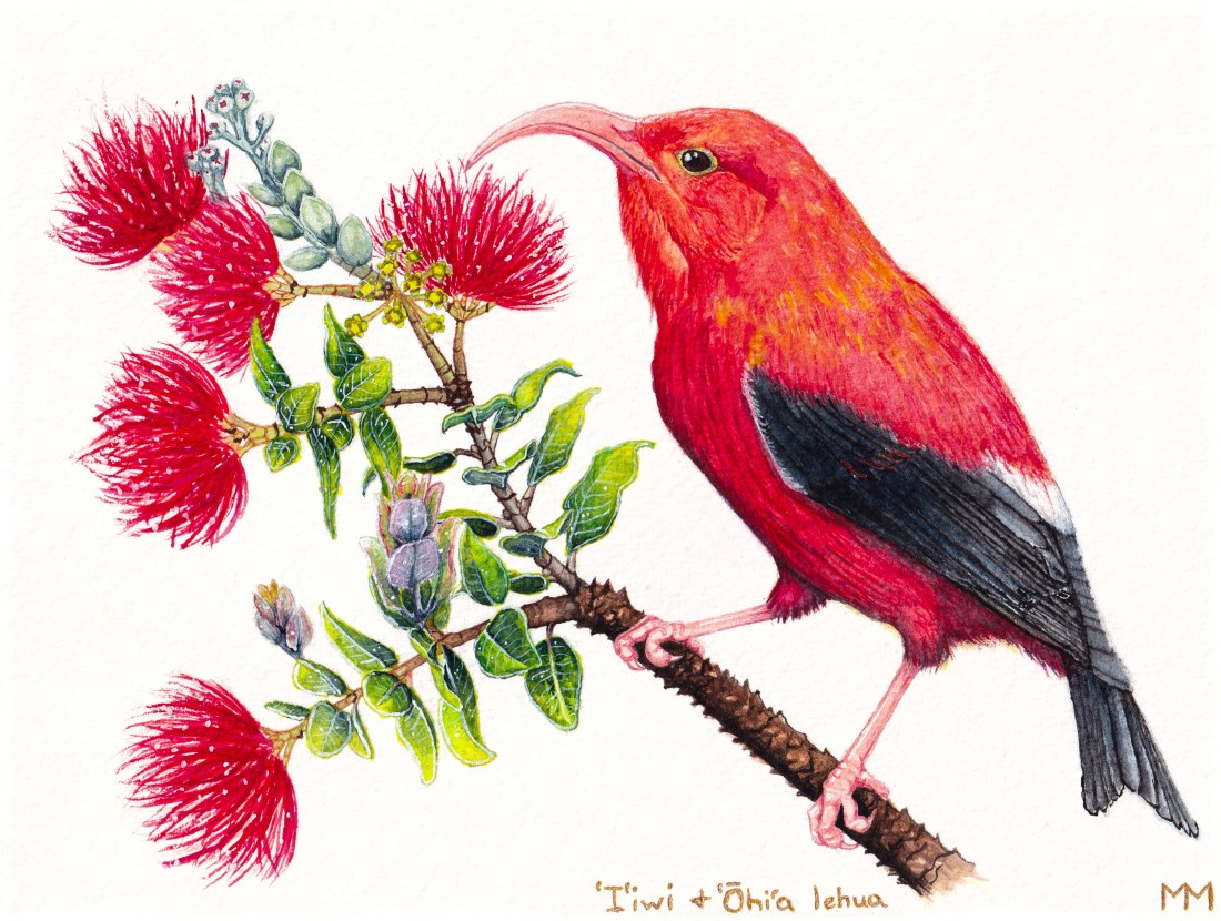Starting on Saturday, December 12 I will be taking pre-orders for a postcard set based on this painting, and a small portion of the proceeds will go towards replanting Hawaiian trees like ʻōhiʻa through donations to the Maui Forest Bird Recovery Project! When the shop is up Iʻll be posting the link here, and I hope youʻll join me in protecting these interreliant native species.