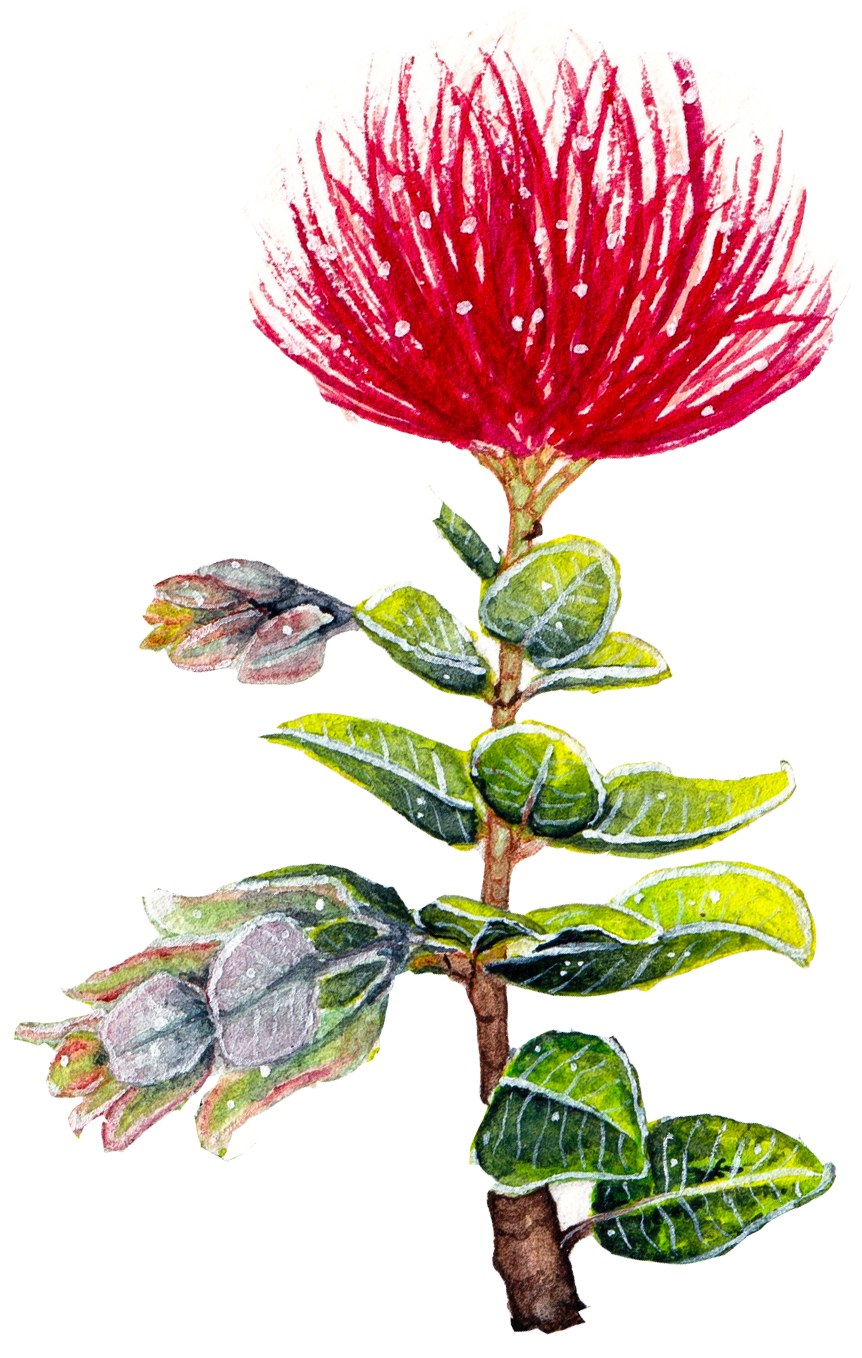 The ʻiʻiwi or scarlet honeycreeper (Drepanis coccinea) and the ʻōhiʻa lehua (Metrosideros polymorpha) are cooperating species native to Hawaiʻi. The ʻiʻiwi bird eats nectar—its curved beak lets it sip from flowers–and the lehua flowers of the ʻōhiʻa tree are one of its favorite food sources. The ʻōhiʻa is a powerfully important tree both ecologically and culturally: Its forests provide habitat to many native birds like the ʻiʻiwi, but it also provides a scaffold for Indigenous art and myth. In legend, the tree is a great warrior who rejected the goddess Pele’s love, and was transformed into a gnarled tree. It is the first tree to grow on settled lava flows—the first tree to return after Pele has shaped the land.